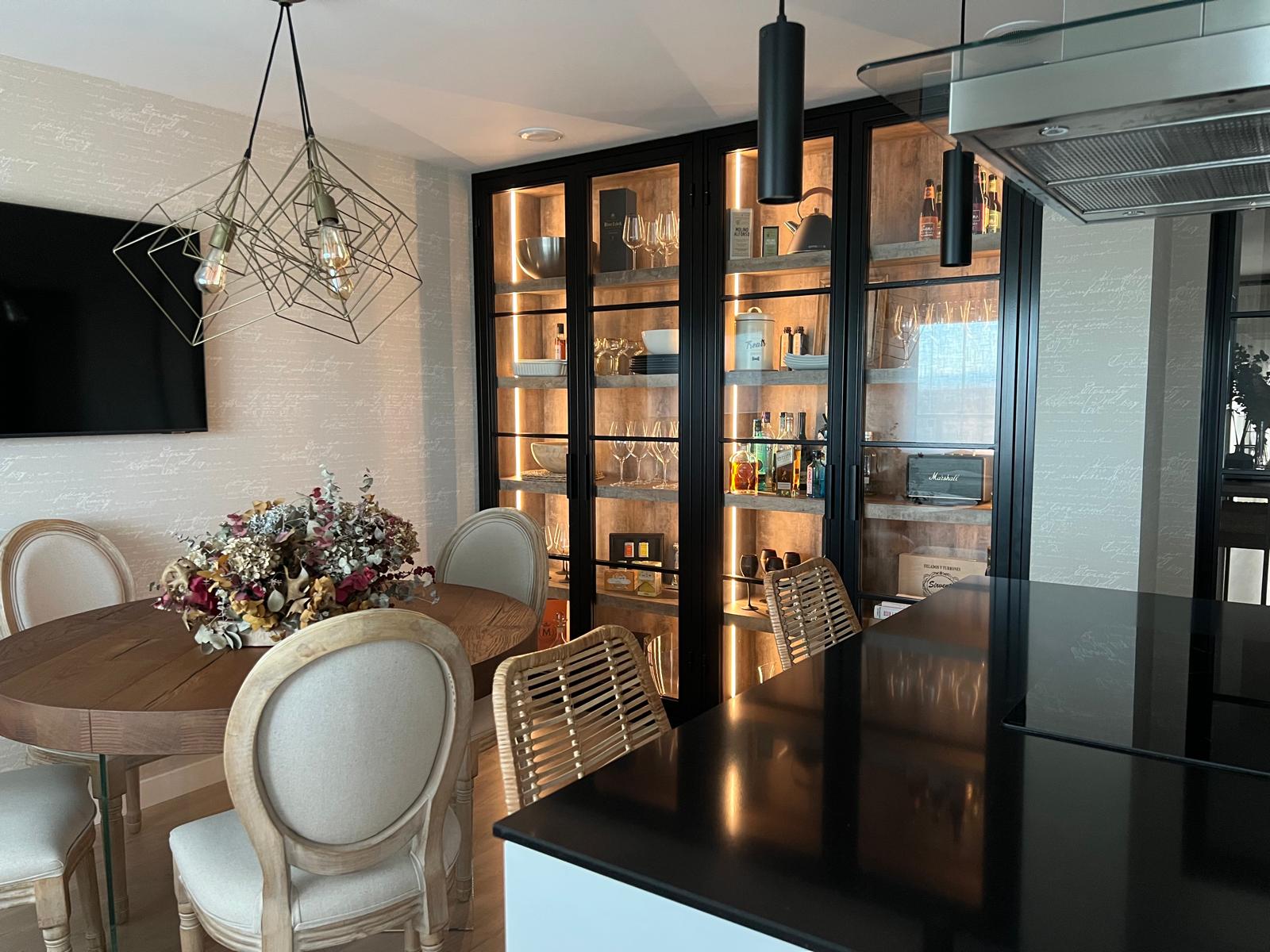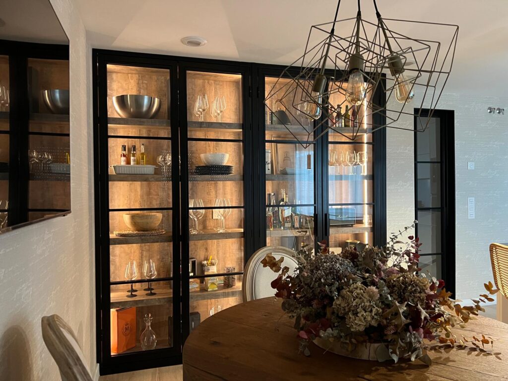 Las vitrinas de hierro junto a la madera envejecida y la iluminación integrada crean un punto de fuerza visual pero amable para el conjunto.