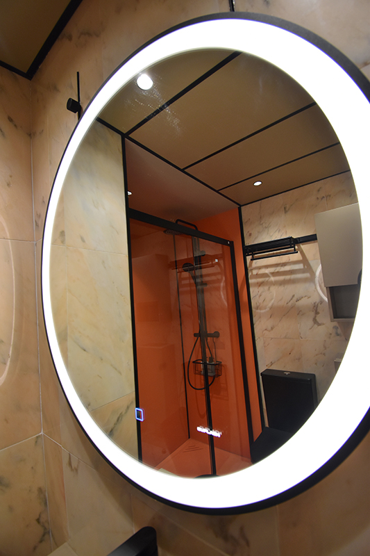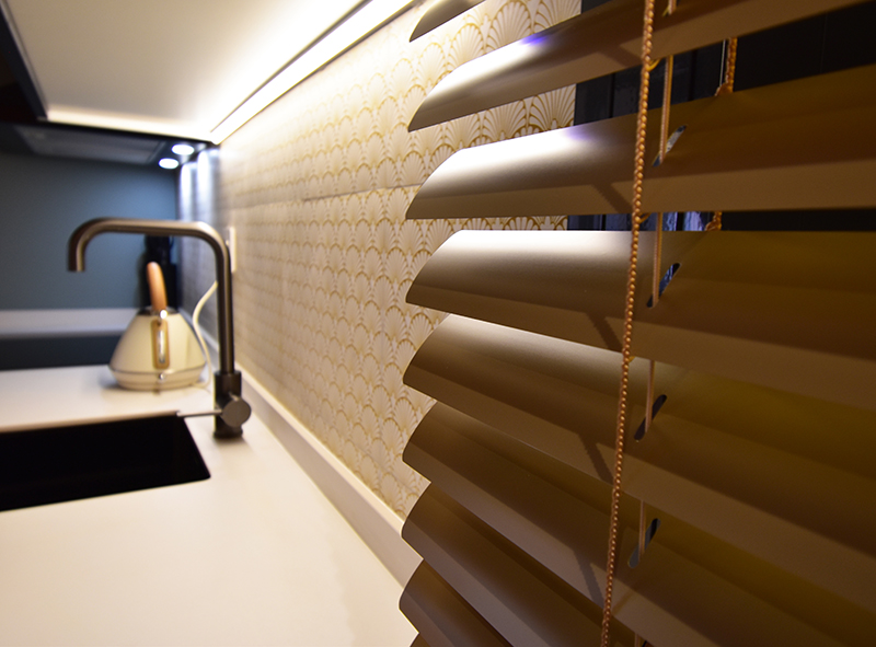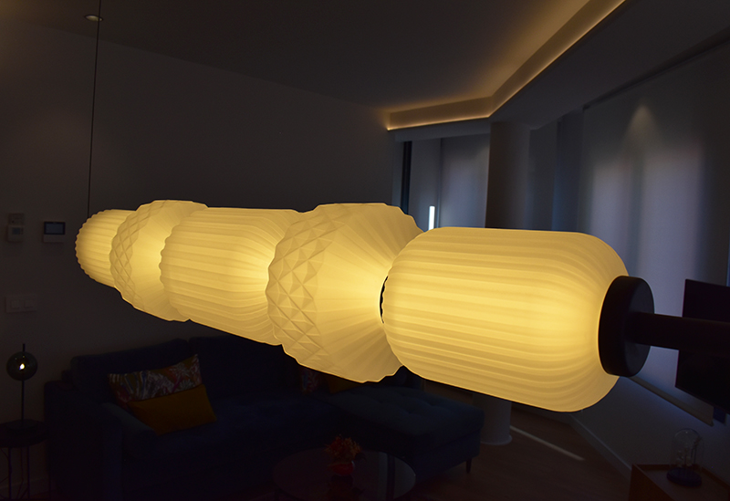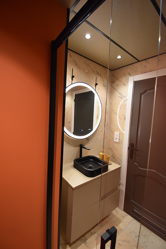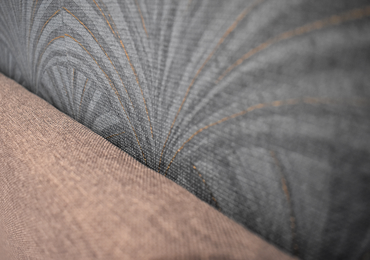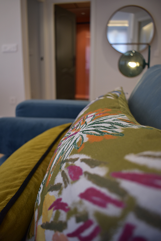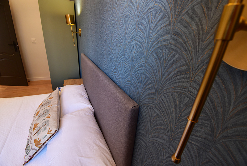 Grafismo Art-decó en varios revestimientos, maderas naturales, lacados, textiles lisos, estampados y elementos decorativos variados componen un conjunto estético moderno, con ritmo visual y armonizado por una iluminación equilibrada y eficiente.